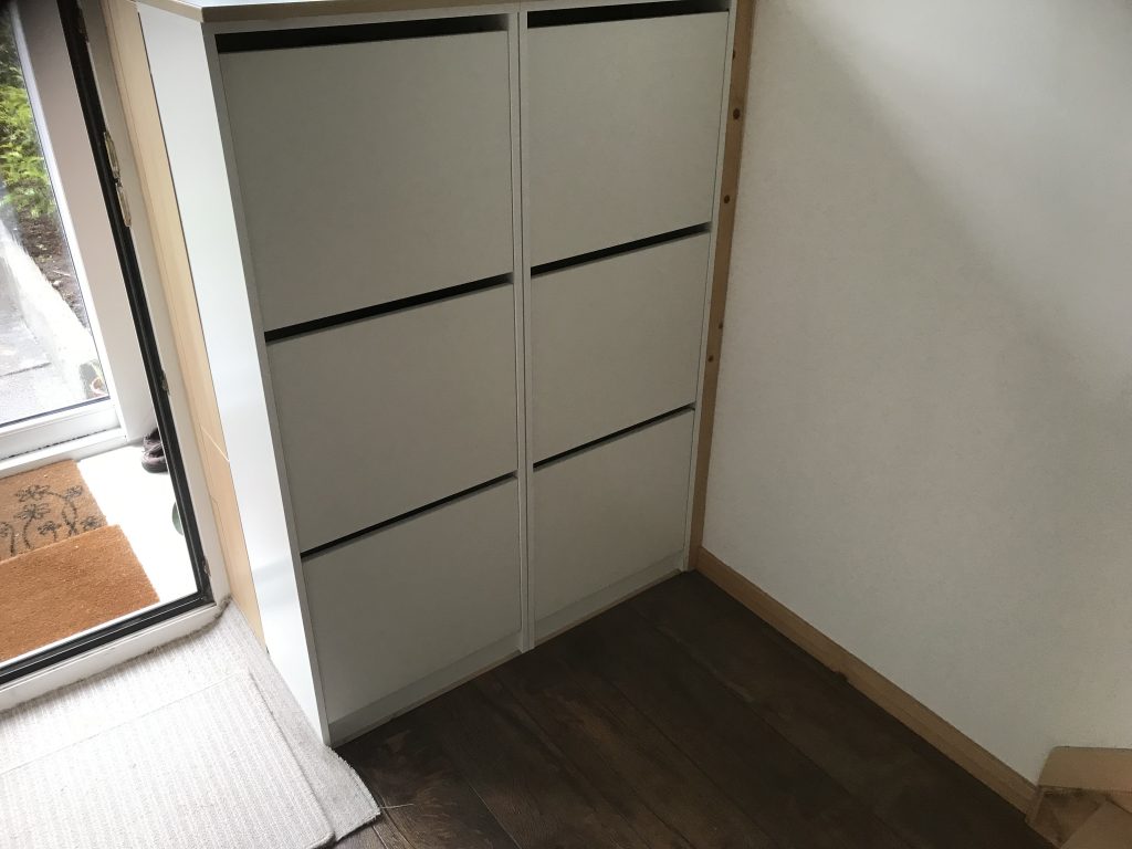 Join two IKEA shoe storage cupboards to disguise a meter box and increase storage space.