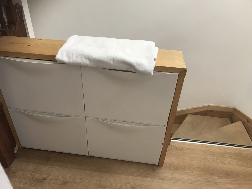 Join two IKEA shoe storage cupboards to disguise a meter box and increase storage space.