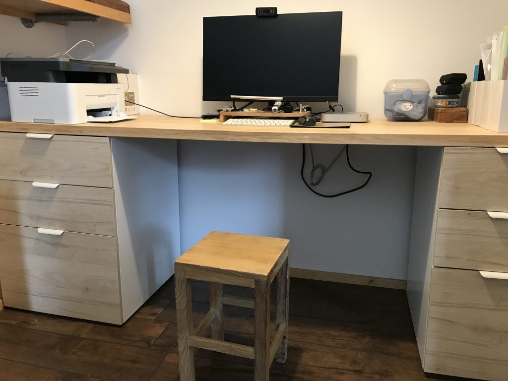 A very large work-from-home desk from two IKEA kitchen units and a discounted kitchen counter-top for less than the price of a desk from a store.