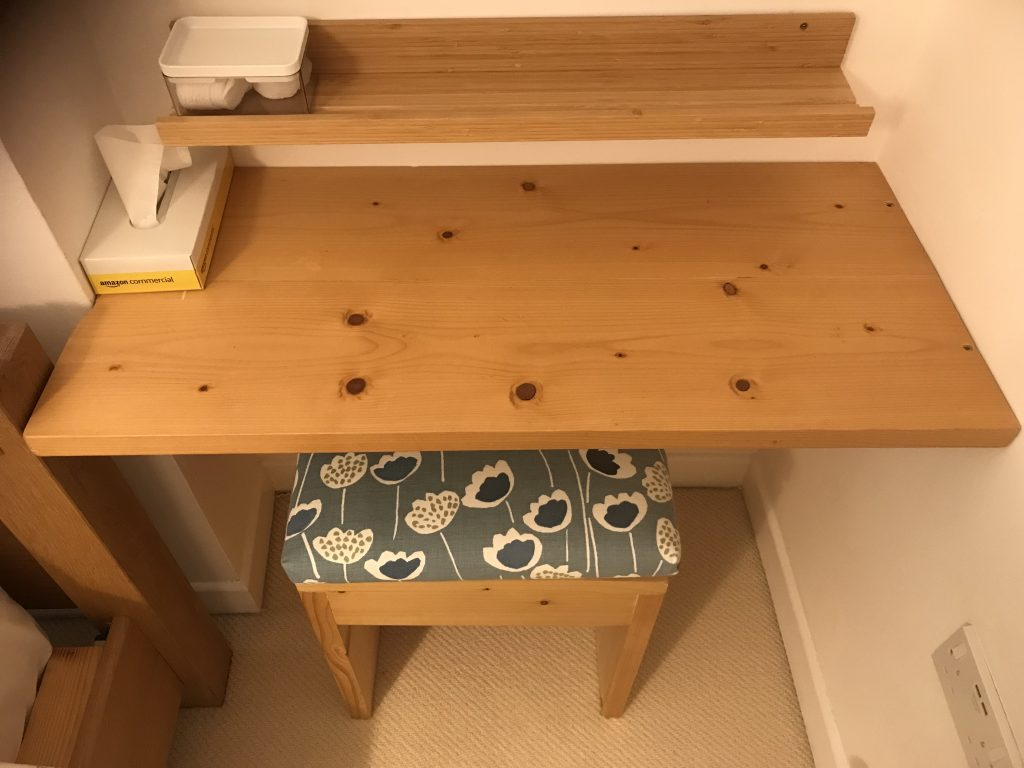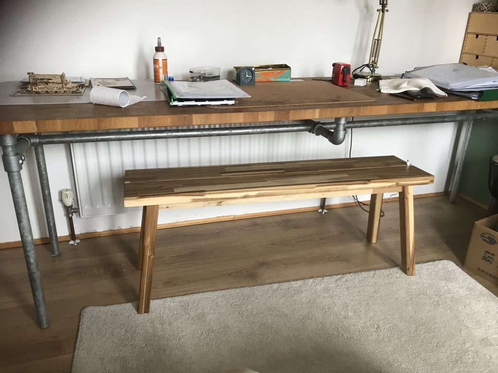 Using scaffold bars and slightly damaged, discounted kitchen worktop to make a study/craft table for a teenager (2.4m long).