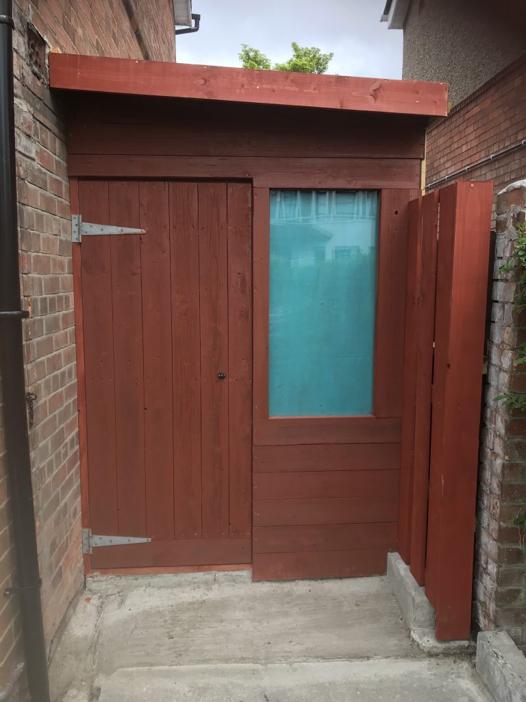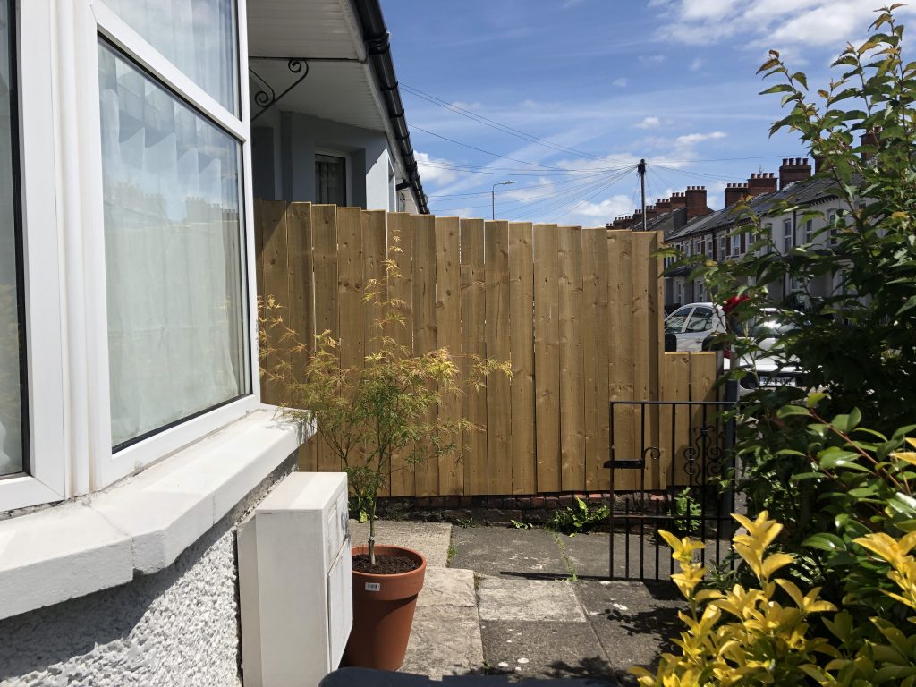 This is a tall (2m), sloping screen for a terraced house. The owners wanted privacy from neighbours and protection from the wind for their plants. This economical timber screen is easily and quickly erected and doesn’t cost the Earth. The two panels nearest the gate are only one metre tall to comply with Belfast City Council regulation in relation to visibility of the pavement for the neighbour. The timber for the screen is treated for outdoor use so it can be painted or left unpainted to turn silver in about a year.