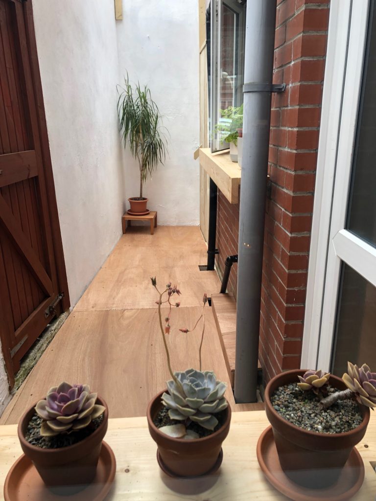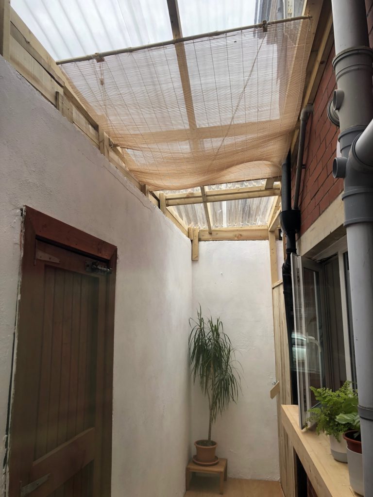 This must be the cheapest way to create a new room. Polycarbonate roof panels and a plywood floor with access to drains (legal requirement). The wooden windowsills finish the look.